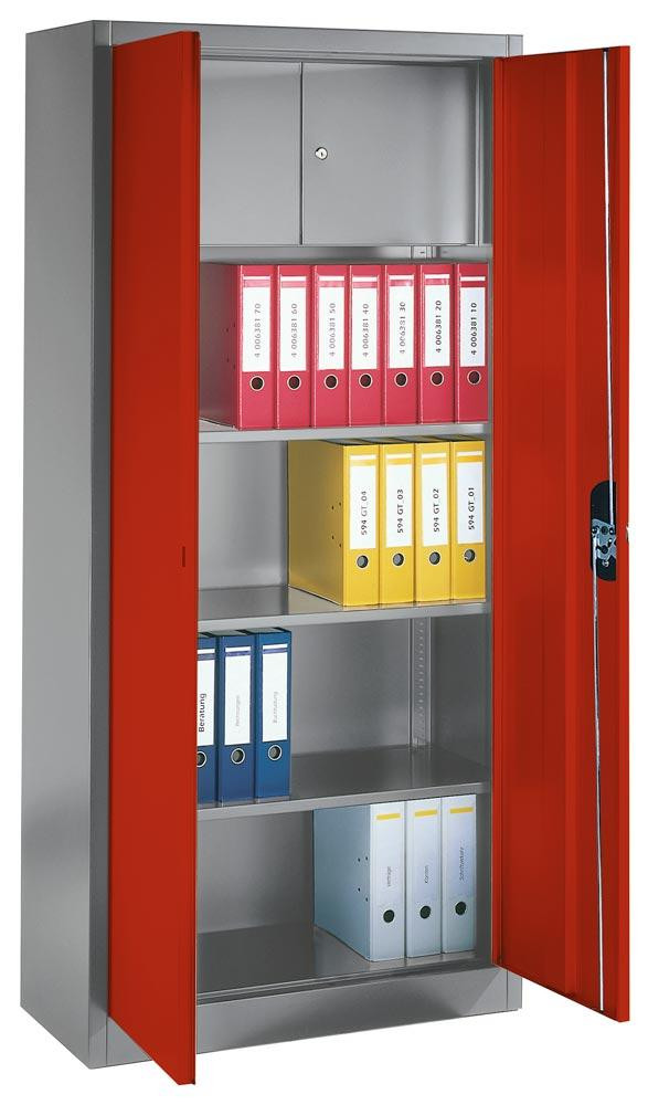 Flügeltürenschrank, BxTxH 930x400x1950 mm, 1 Schließfach, 3 lackierte Fachböden, RAL 7035/3003 lichtgrau/rubinrot