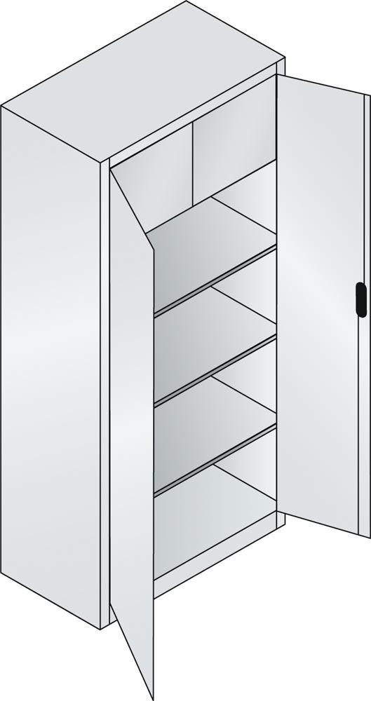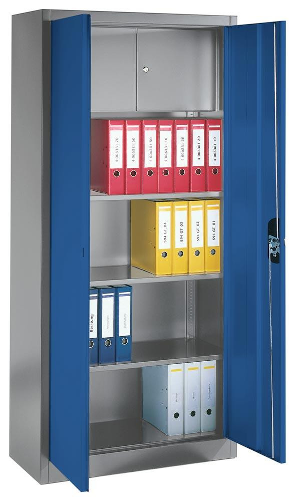 Flügeltürenschrank, BxTxH 930x500x1950 mm, 1 Schließfach, 3 lackierte Fachböden, RAL 7035/5010 lichtgrau/enzianblau