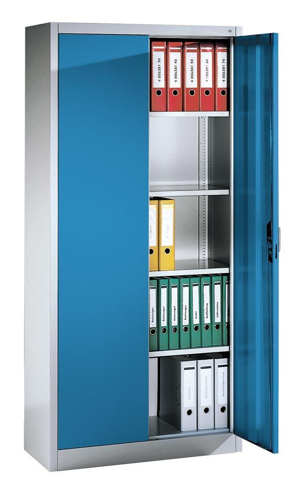 Flügeltürenschrank, BxTxH 930x500x1950 mm, 4 lackierte Fachböden, RAL 7035/5012 lichtgrau/lichtblau