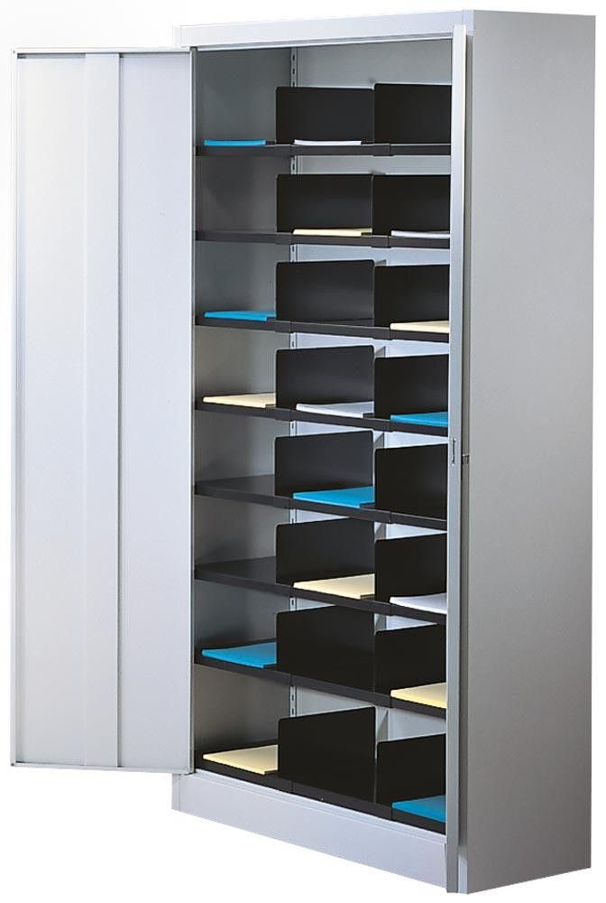 ∙ Stabil verschweißte Stahlkonstruktion mit verwindungsfesten Türen mit Kastenversteifung · Flügeltüren mit Dreiriegelverschluss und Drehzylinder-Sicherheitsschloss, verschiedenschließend ∙ Türöffnungswinkel ca. 135° · Fachböden verstellbar im 35 mm Raster · Inneneinrichtung in schwarz · Traglast pro Fachboden 65 kg (bei gleichmäßig verteilter Last)