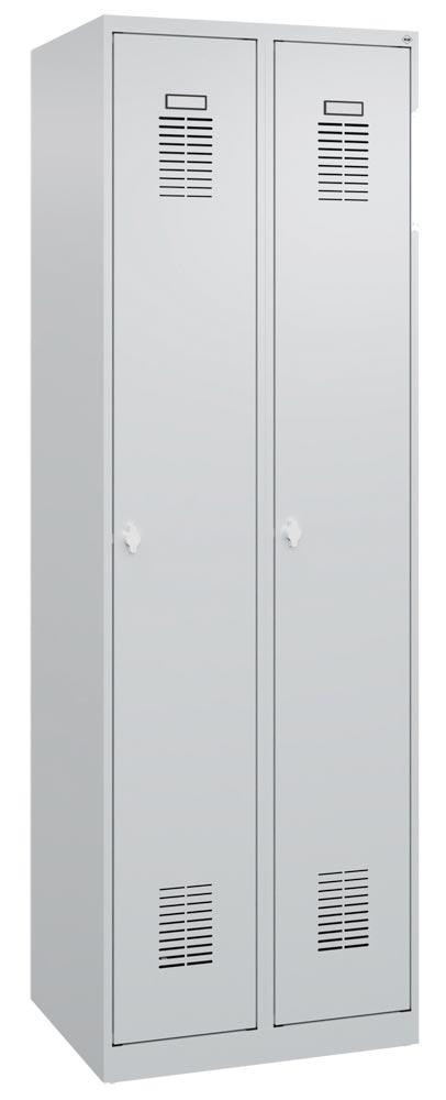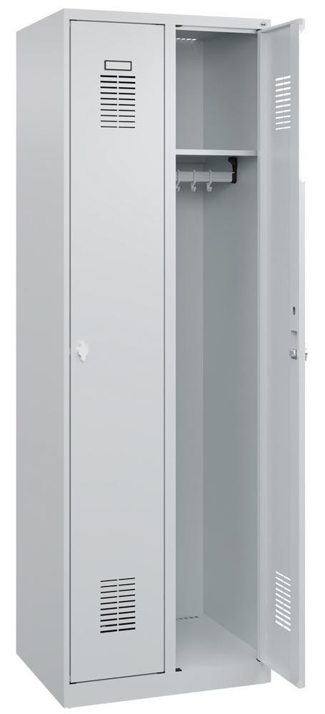 ∙ Stabile Stahlkonstruktion mit hochwertiger Einbrennbeschichtung ∙ Verstärkte Türen mit Anschlagsdämpfer für geräuscharmes Schließen ∙ Lochbild in der Tür für optimale Belüftung ∙ Stabile Garderobenstange mit 3 verdrehsicheren Schiebehaken ∙ Glatter Abteilboden für einfaches Auskehren ∙ Fußteil und Schrankboden serienmäßig verzinkt für erhöhten Korrosionsschutz ∙ Fest verschweißter Ablageboden pro Abteil ∙ Optimierte Lüftungsöffnungen im Abteil · Pro Abteil 1 Ablageboden · T x H 500 x 1850 mm · Wahlweise 2, 3 oder 4 Abteile, jeweils 300 mm breit · Drehriegelverschluss für Vorhangschloss