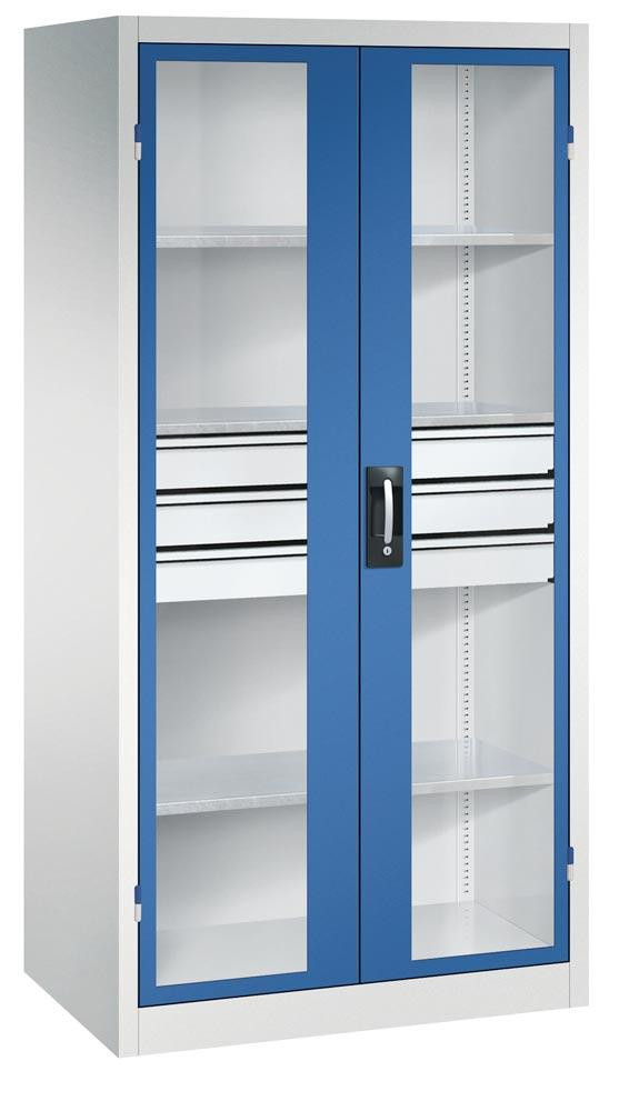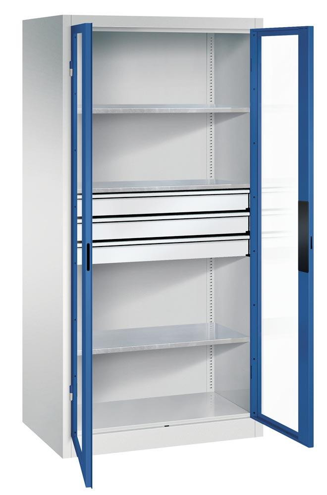 Großraum-Werkzeugschrank mit Sichfensterflügeltüren, 3 Schubladen mittig, 3 Verstellböden, BxTxH 930x600x1950 mm, RAL 7035/5010