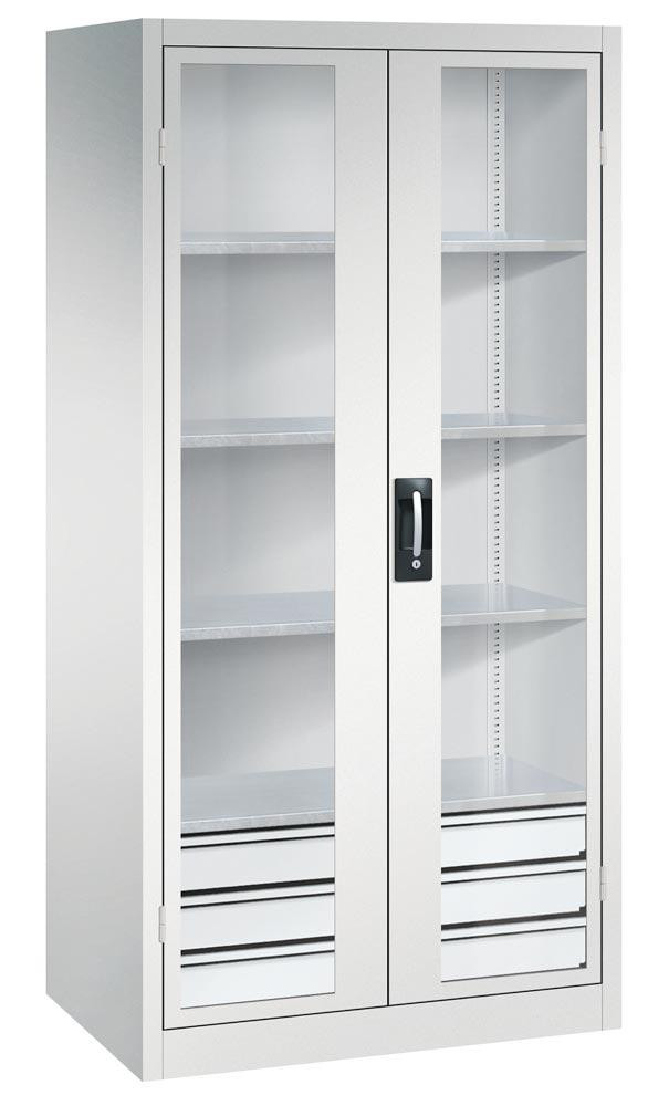 Großraum-Werkzeugschrank mit Sichfensterflügeltüren, 3 Schubladen unten, 4 Verstellböden, BxTxH 930x600x1950 mm, RAL 7035