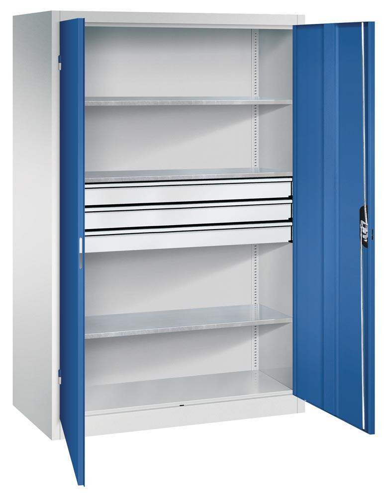 Großraum-Werkzeugschrank mit Vollblech-Flügeltüren, 3 Schubladen mittig, 3 Verstellböden, BxTxH 1200x500x1950 mm, RAL 7035/5010