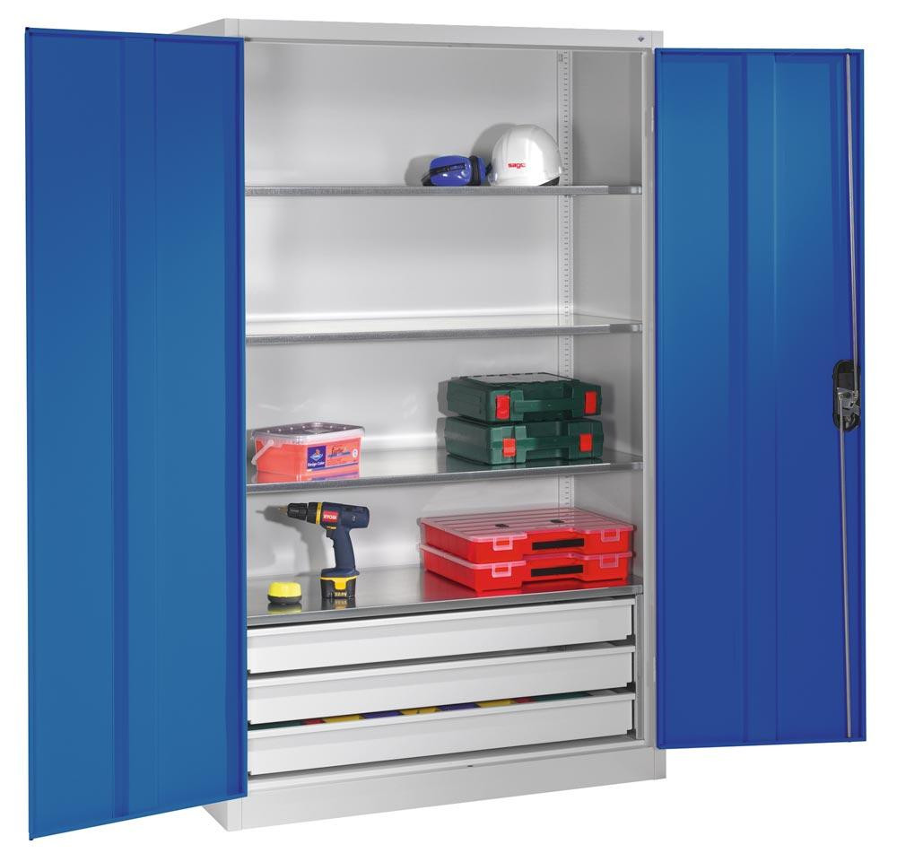 Großraum-Werkzeugschrank mit Vollblech-Flügeltüren, 3 Schubladen unten, 4 Verstellböden, BxTxH 1200x500x1950 mm, RAL 7035/5010