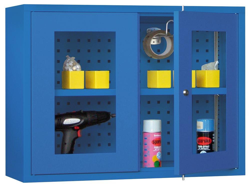 Hängeschrank, 2 Sichtfenstertüren, Rückwand gelocht, 1 verstellbarer Boden, Zylinderschloss, BxTxH 800x300x600 mm, RAL 5015