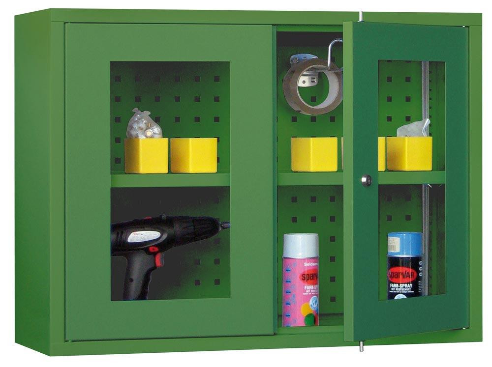 Hängeschrank, 2 Sichtfenstertüren, Rückwand gelocht, 1 verstellbarer Boden, Zylinderschloss, BxTxH 800x300x600 mm, RAL 6011