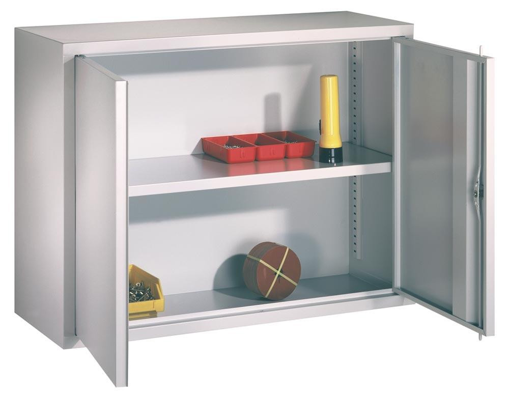 Hängeschrank, 2 Vollblechtüren, Rückwand glatt, 1 verstellbarer Boden, Zylinderschloss, BxTxH 800x300x600 mm, RAL 7035