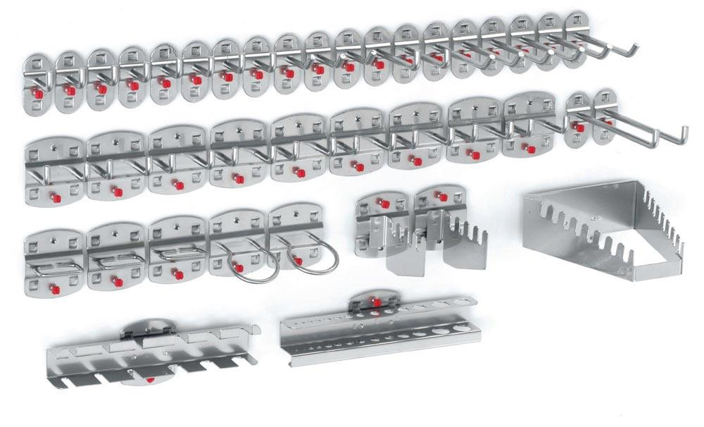 40-teilig Lieferumfang: 9 Werkzeughalter mit schrägem Ende, 12 Werkzeughalter mit senkrechtem Ende, 9 doppelte Werkzeughalter, 3 Zangenhalter, 2 Maschinenhalter, 1 Schraubenschlüsselhalter, 1 Schraubendreherhalter, 1 Bohrerhalter, 2 Sägenhalter