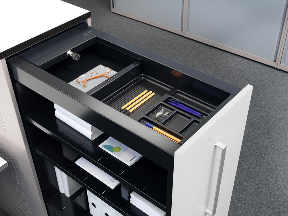 · Serienmäßig akustisch wirksame Seitenwände · Kunststoffschicht-Abdeckplatte 25 mm stark · Auszug mit Selbsteinzug und geräuschhemmendem Dämpfsystem · Inkl. 2 Fachböden, Materialschale und separat abschließbarem Privatfach · Zubehör wie Kleinschublade, Fachteiler und Hängeregistratur sind optional erhältlich