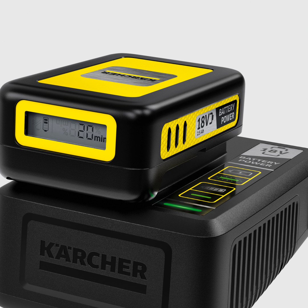 Das Schnellladegerät kann dank der integrierten Wandhalterung ganz einfach an der Wand befestigt werden. Mit dem Schnellladegerät ist der 18 V / 2,5 Ah Kärcher Battery Power-Wechselakku in nur 44 Minuten zu 80 Prozent aufgeladen. Auch alle weiteren 18-V-Wechselakkus der 18 V Kärcher Akkuplattform können damit aufgeladen werden.
