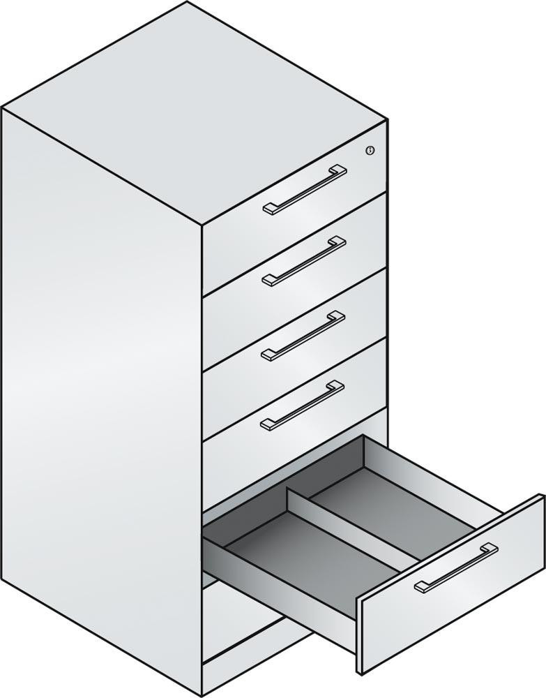 ∙ Robuste und langlebige Stahlkonstruktion mit hochwertiger Einbrennlackierung ∙ Schubladen auf 100 % ausziehbaren Kugelrollen-Teleskopführungen ∙ Schubladenfronten mit matt-verchromtem Bügelgriff ∙ Zentralverschluss mit Auszugsperre ∙ Austauschbarer Wechselkern, inkl. 2 Schlüsseln ∙ Inkl. selbstklebenden Kunststoff-Etikettenrahmen