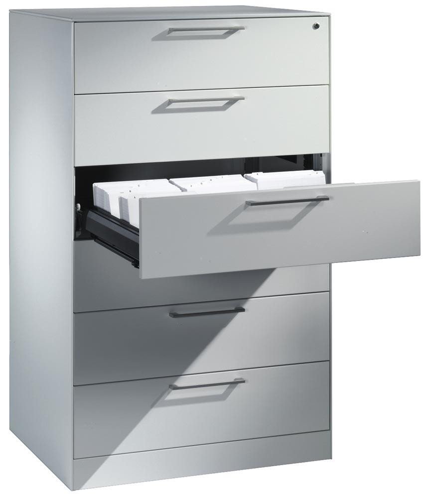 ∙ Robuste und langlebige Stahlkonstruktion mit hochwertiger Einbrennlackierung ∙ Schubladen auf 100 % ausziehbaren Kugelrollen-Teleskopführungen ∙ Schubladenfronten mit matt-verchromtem Bügelgriff ∙ Zentralverschluss mit Auszugsperre ∙ Austauschbarer Wechselkern, inkl. 2 Schlüsseln ∙ Inkl. selbstklebenden Kunststoff-Etikettenrahmen