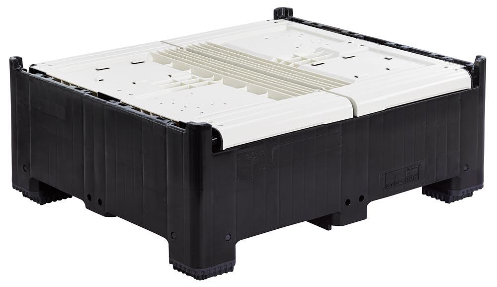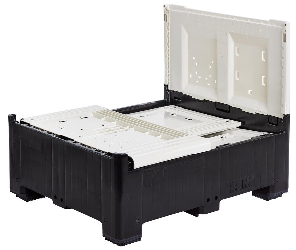· Aus recyclebarem Polyethylen · Inklusive Entnahmeklappe an einer Längsseite · Ideal für eine ökonomische und zuverlässige Lagerung in der Industrie, dem Handel oder der Landwirtschaft · Einfaches Aufrichten und Zusammenklappen für eine Verbesserung der Betriebsabläufe Zusammenklappen der Wände ermöglicht je nach Höhe einen Raumgewinn von 1:2 oder 1:3 · Passgenaue Stapelung möglich · Farbe schwarz/elfenbein