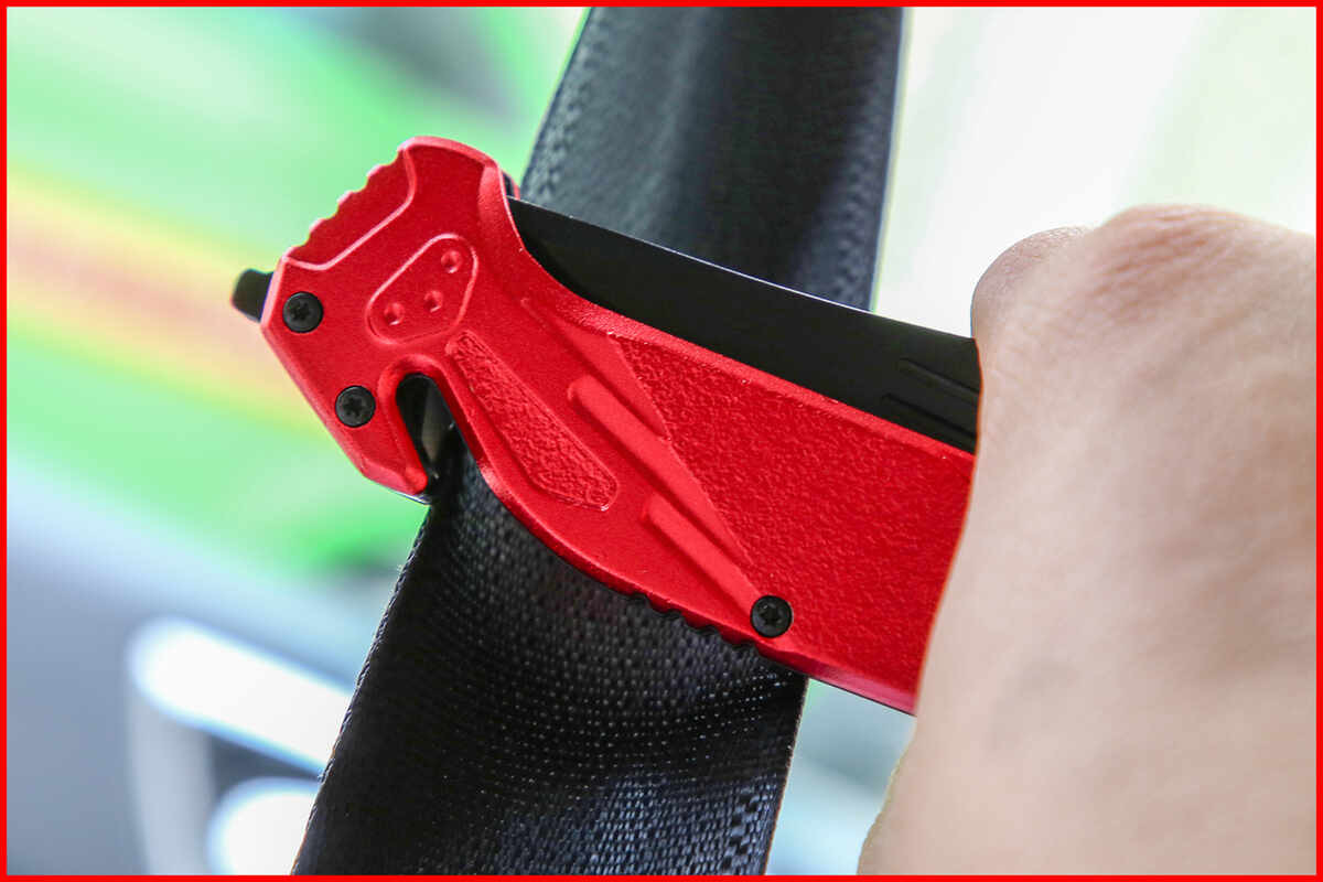 - integrierter Gurtschneider am Griff