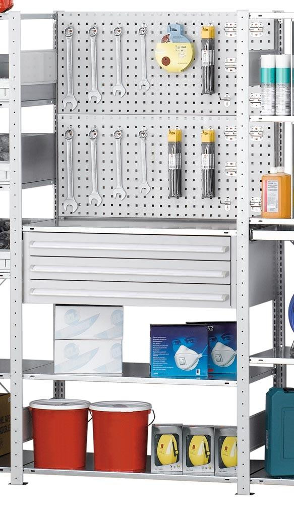 Kleinteile-Regalmodul 3, Grundfeld, BxTxH 1000x500x2000 mm, 3 Böden verz. 150 kg, 1 Schlitz-/ 1 Lochplatte, 1x3er Schublade