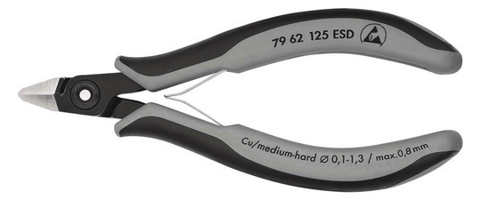 ESD · für feinste Schneidarbeiten z. B. in Elektronik und Feinmechanik · geschliffene, scharfe Schneiden · Schneiden zusätzlich induktiv gehärtet, Schneidenhärte ca. min. 64 HRC · ca. 20% weniger Gewicht · geschraubtes Gelenk · Öffnungsfeder · Chrom-Vanadin-Kugellagerstahl, geschmiedet, mehrstufig ölgehärtet · elektrisch ableitend - dissipativ