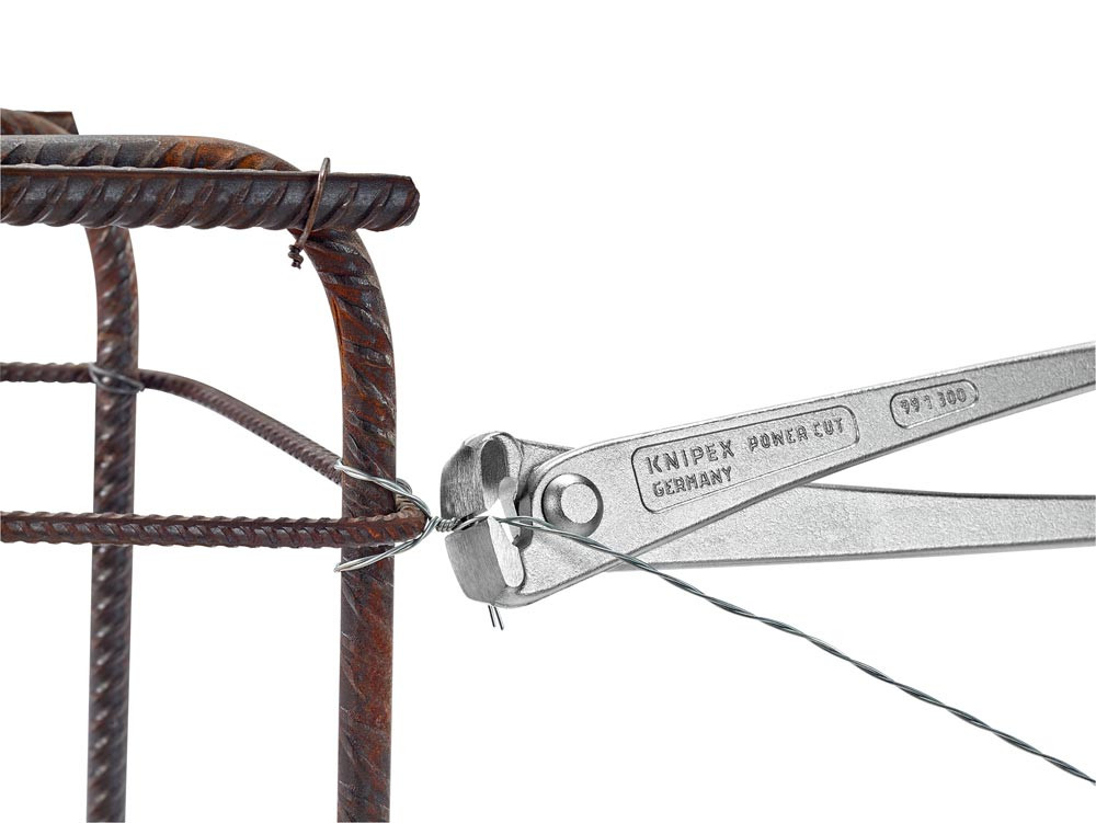25 % Kraftersparnis gegenüber herkömmlichen, gleich großen Monierzangen · schlanke Form zum Binden tiefliegender Eisen · zum Verdrillen und Abschneiden des Drahtes in einem Arbeitsgang · Schneiden zusätzlich gehärtet, Schneidenhärte ca. 61 HRC · Spezial-Werkzeugstahl in Sondergüte, geschmiedet, mehrstufig ölgehärtet