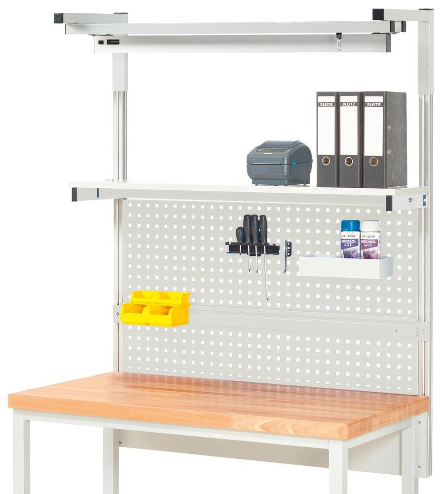 Komplettaufbau für Werkbank B 1250 mm mit Auslegerpaar, 2 x Laufschiene, Laufwagen, LED-Leuchte, Lochplatte H 450mm, Halteschiene, RAL 7035