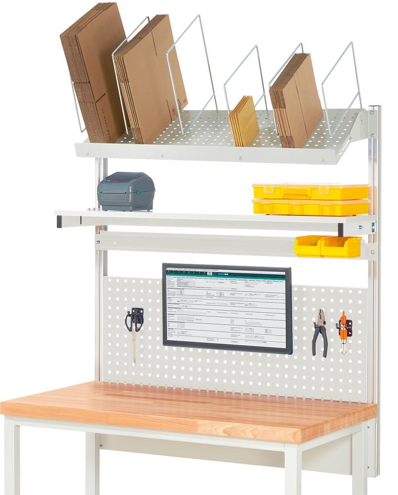 Komplettaufbau für Werkbank B 1250 mm mit Etagenbord, Lochplatte H 450 mm, Montageadapter, Kartonagemagazin,Halteschiene, RAL 7035