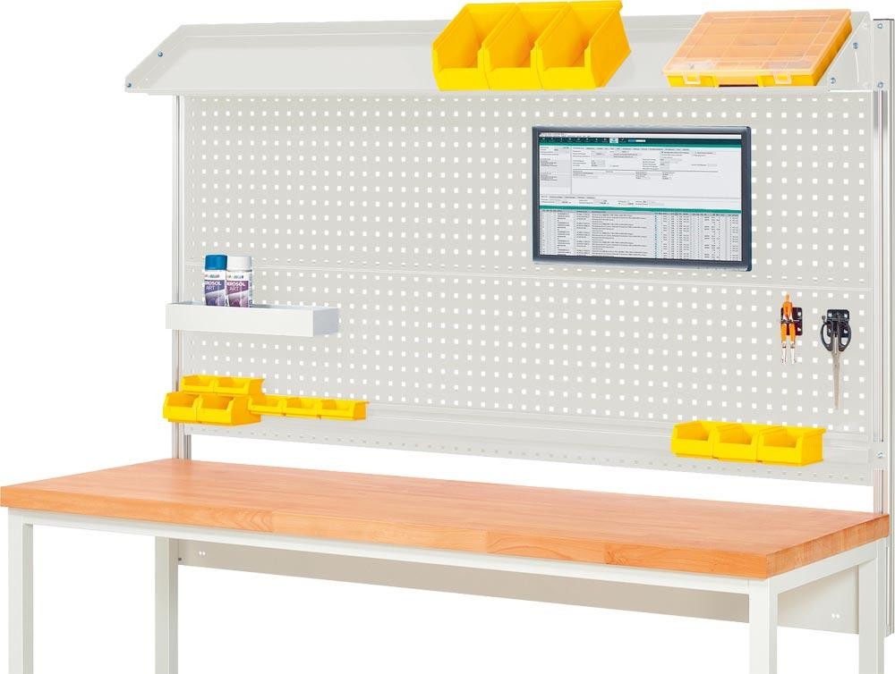 Komplettaufbau für Werkbank B 2000 mm mit Ablage, 2 x Lochplatte H 450 mm, Montageadapter, Halteschiene, RAL 7035