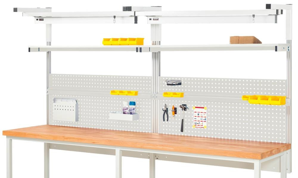 Komplettaufbau für Werkbank B 3000 mm mit Auslegerpaar, 2 x Laufschiene, Laufwagen, LED-Leuchte, Lochplatte H 450mm, Halteschiene, RAL 7035