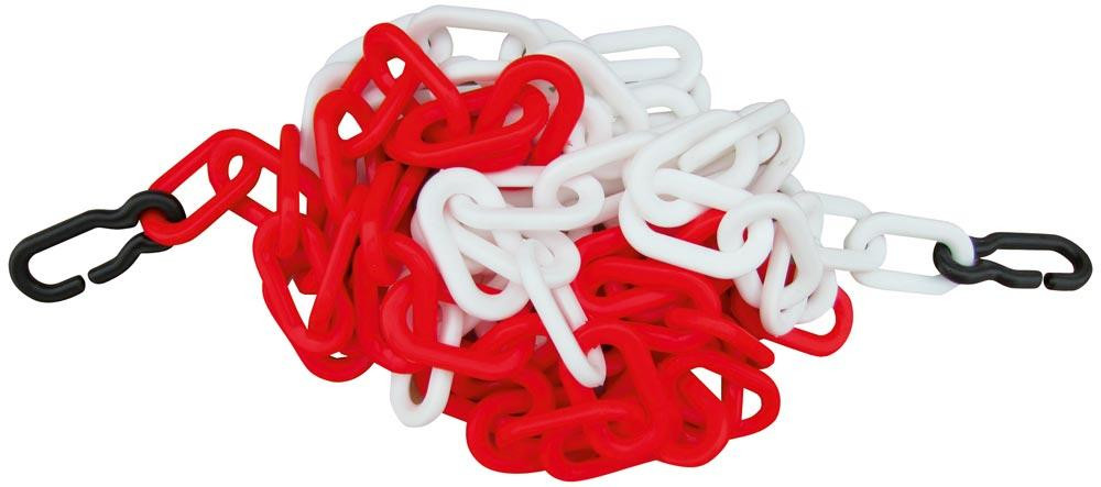 · Material Polypropylen, Flachprofil 9 mm · Farbe rot/weiß · Länge 3 m · Inkl. 2 Universalhaken je Kette · VE 3 Stück