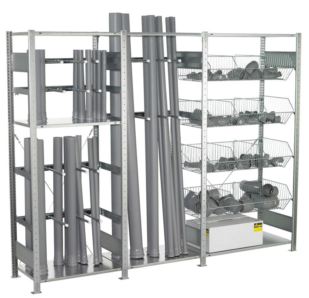Langgutregal-Set, BxTxH 2500x500x2000 mm, verz., 2 Felder a 750 mm mit Unterteilungstäben, 1 Feld 1000 mm mit Drahtgitterkörben