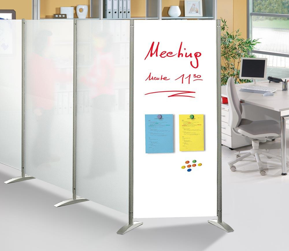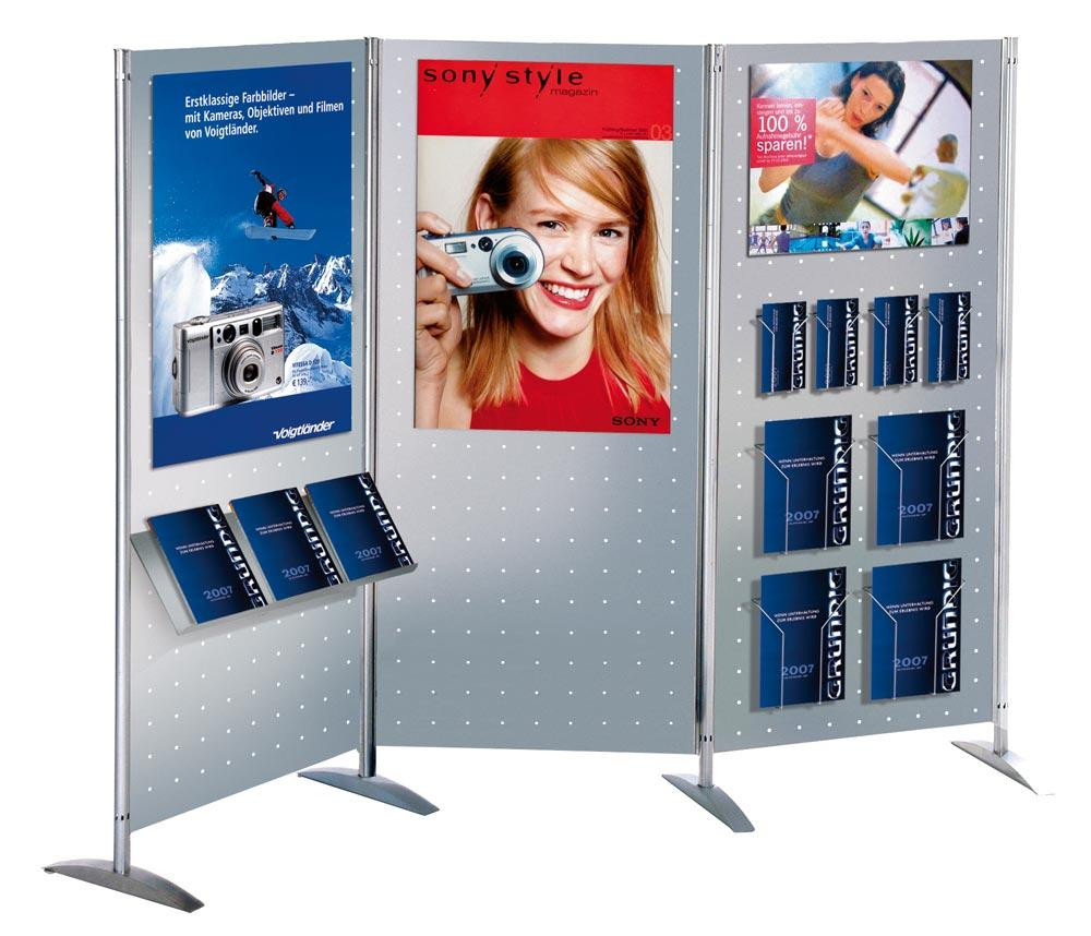 · Praktische Stellwände · Beliebig erweiterbar durch einfaches Anbauverfahren · Die Elemente lassen sich linear (180°) oder in drei Winkelstellungen (45°, 90° oder 135°) aufstellen · Lochplatten und Standsäulen aus stabilem Stahl, pulverbeschichtet in RAL 9006 alusilber · Durch umfangreiches Zubehör machen Sie aus Ihrer Stellwand im Handumdrehen eine Moderations- oder Präsentationswand