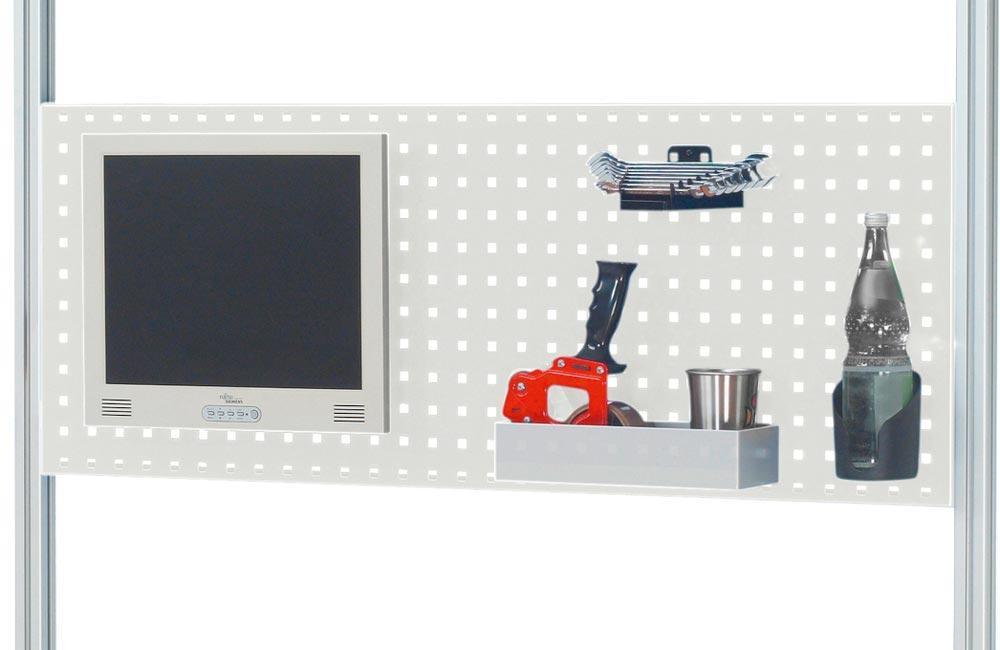· H 650 mm · Lochung 10 x 10 mm · Abstand Lochmitte-Lochmitte 38 mm · Die Anbauelemente Etagenbord, Metallablage und Halteschiene für Sichtlagerkästen könne davor bzw. dahinter montiert werden · Belastbar bis max. 30 kg · Montage an Komplettaufbau 1-4 oder LEER · Zur Aufnahme von Enrgieleiste, Lochplatten-Zubehör und Flachbildschirmhalter für Lochplatte