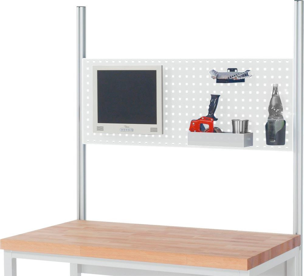 · Lochung 10 x 10 mm · Abstand Lochmitte - Lochmitte 38 mm · Die Anbauelemente Etagenbord, Metallablage und Halteschiene können davor bzw. dahinter montiert werden · Belastbar bis max. 30 kg · Montage an: Aufbau-Strebenpaar · Zur Aufnahmae von Energieleiste, Lochplatten-Zubehör und Flachbildschirmhalter für Lochplatte