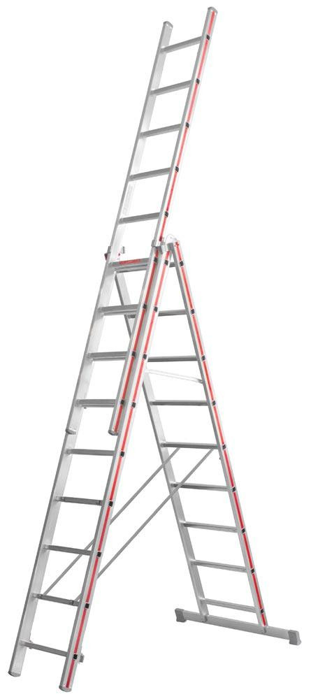 Mehrzweckleiter, 3-teilig, 3x9 Sprossen, Länge als Anlegeleiter 6550 mm, senkr. Höhe mit Steckteil 4330 mm, Perlongurte, Gewicht 18,0 kg