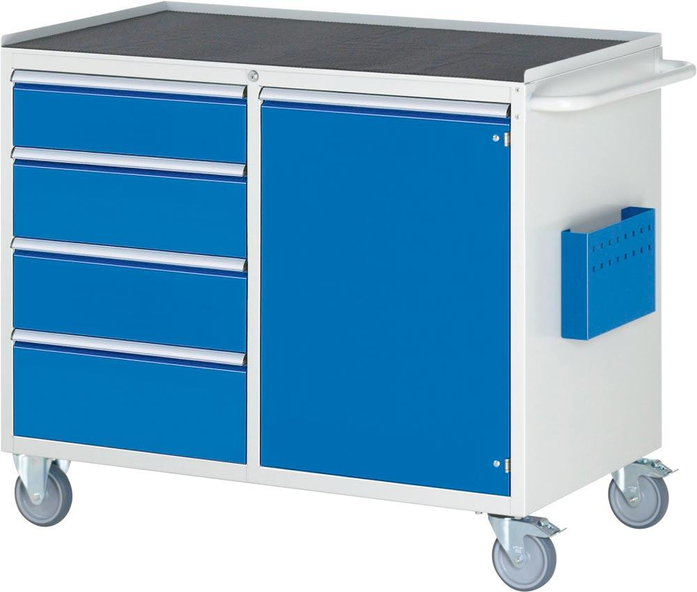 Montagewagen mit Metall Platte, BxTxH 1145x650x975 mm, 4 Schubladen 1x150, 2x180, 1x210 mm, 1 x Flügeltür 720 mm, RAL 7035/5010