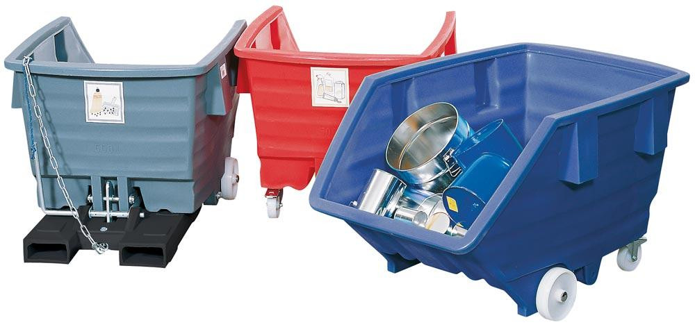 Muldenkippbehälter aus PE, Vol. 0,75 cbm, LxBxH 1560x1150x925 mm, Traglast 250 kg, mit Radsatz, Farbe blau