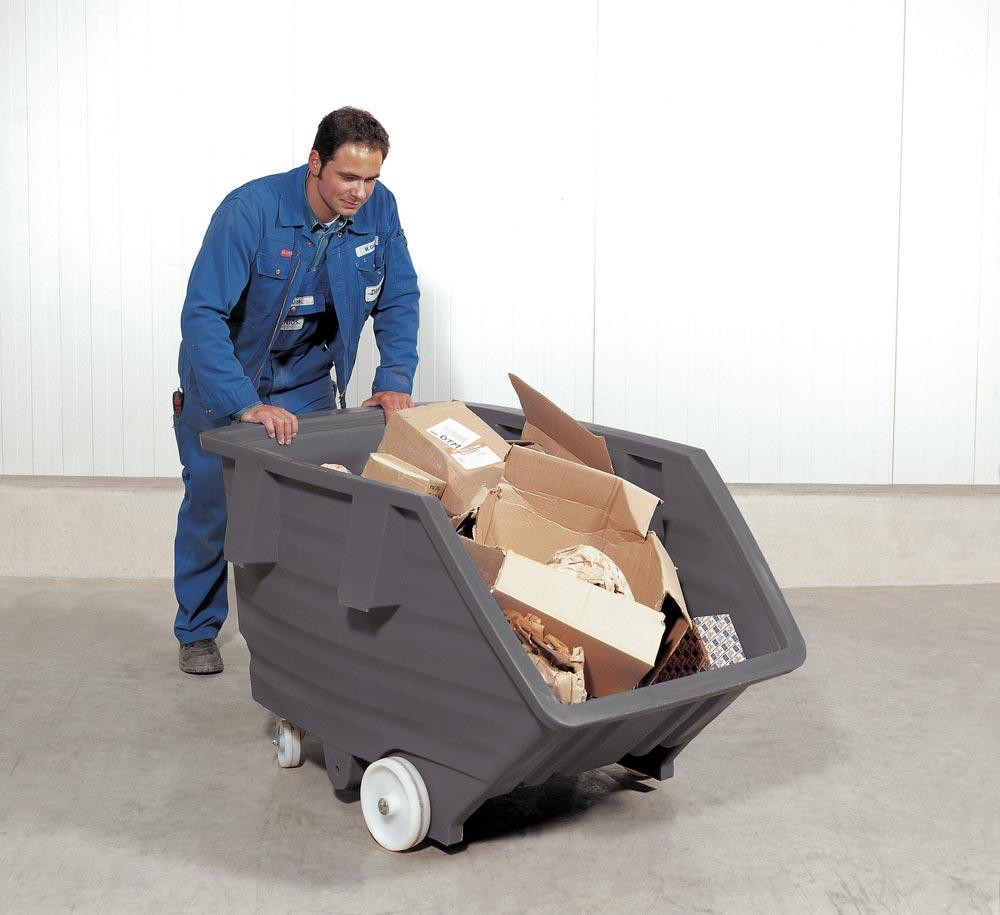 Muldenkippbehälter aus PE, Vol. 0,75 cbm, LxBxH 1560x1150x925 mm, Traglast 250 kg, mit Radsatz, Farbe grau
