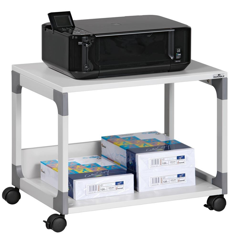 · Aus stabilem, epoxidharzbeschichtetem Stahl mit glasfaserverstärkten Kunststoffecken · Melaminbeschichtete Böden, 19 mm stark · 4 Doppellaufrollen, davon 2 Rollen mit Feststeller · Traglast je Fachboden 30 kg