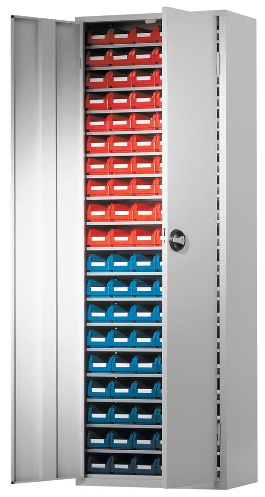 · Solide, innen und aussen schlag- und kratzfeste Stahlkonstruktion mit Kunststoffbeschichtung in RAL 7035 lichtgrau · Fachböden aus verzinktem Stahlblech, im Raster von 15 mm verstellbar · Tür-Öffnungswinkel über 180° · Dreiriegeliges Sicherheits-Zylinderschloss mit versenkbarem Drehgriff · Die Bestückung mit Sichtlagerkästen erfolgt je Größe und farblich sortiert