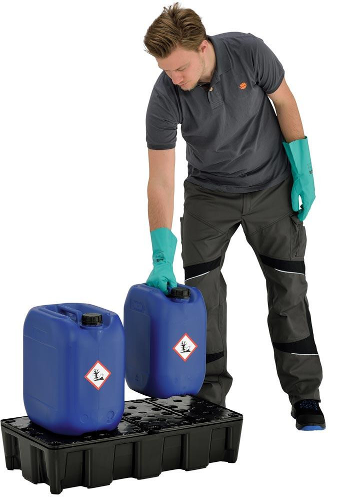für Kleingebinde · zur sicheren und vorschriftsmäßigen Lagerung gewässergefährdenden Flüssigkeiten der GHS-Kategorien 1-4 · aus HD-Polyethylen · sehr beständig gegen Laugen, Öle und Säuren · stapelbar · rutschsichere Plattenoberfläche · konzipiert für Kombination auf Europalette · mit DIBT-Zulassung Nr. Z-40.22-548 und Z-40.22-549