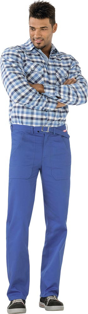 100% Baumwolle, ca. 290 g/m² · einlauffest nach DIN EN ISO 6330 · 2 aufgesetzte Vordertaschen · 1 Gesäß- und Maßtasche · Gürtel mit Metallschnalle · UV Standard 801, Öko-Tex Standard 100