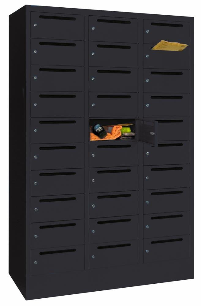 Postverteilschrank, BxTxH 1200x500x1850 mm, 3x10 Fächer, Fachbreite 400 mm, Schloss, Sockel, RAL 7016 anthrazit