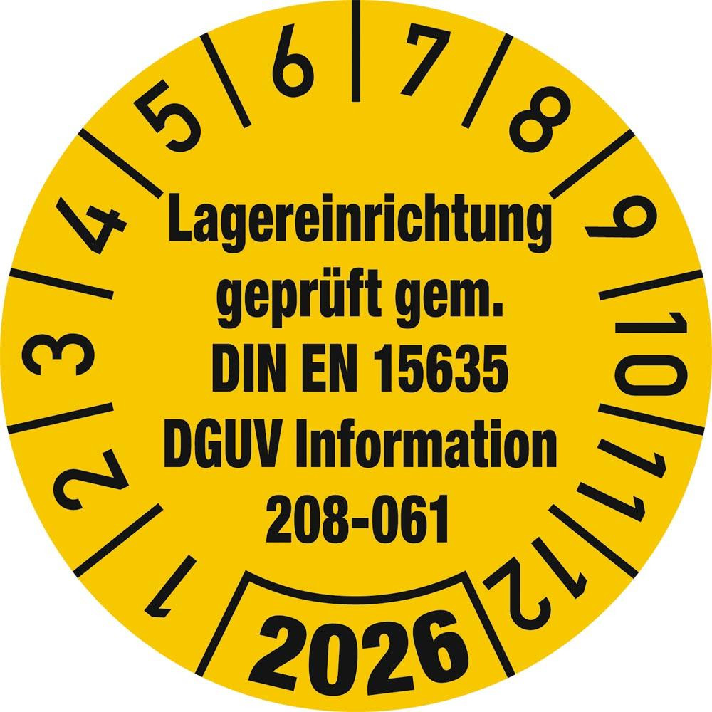 Prüfplakette, Lagereinrichtung geprüft 2026, Durchm. 30 mm, Folie, gelb, VE 10 Stück, Mindestabnahme 10 VE