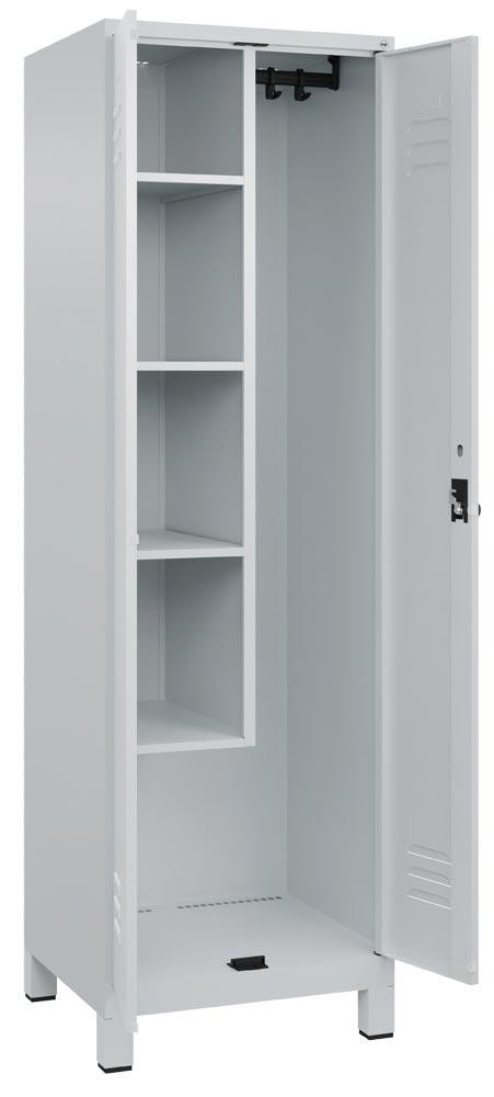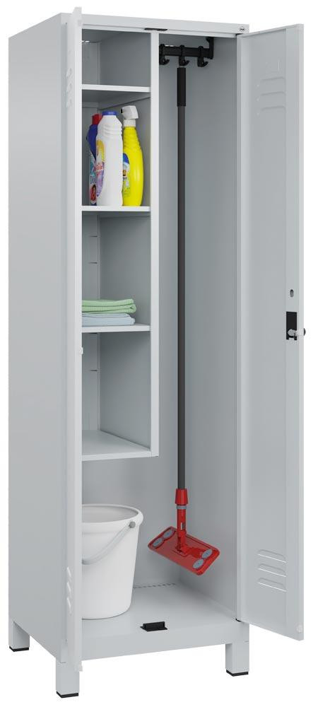 Putzmittelschrank Premium, BxTxH 600x500x1950 mm, 2 Abteile a 300 mm, mit Füßen, Drehriegel, RAL 7035