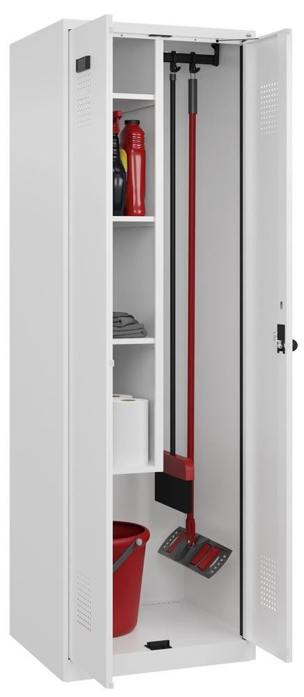 Putzmittelschrank Premium Plus, BxTxH 600x500x1850 mm, 2 Abteile a 300 mm, Bodenstehend, Drehriegel, RAL 7035