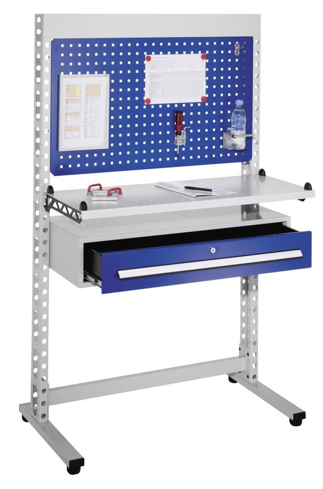 Alle Stahlteile sind in RAL 7035 lichtgrau beschichtet. Ausnahmen sind die Lochplatte und die Schubladenfront, die in RAL 5010 enzianblau beschichtet sind.