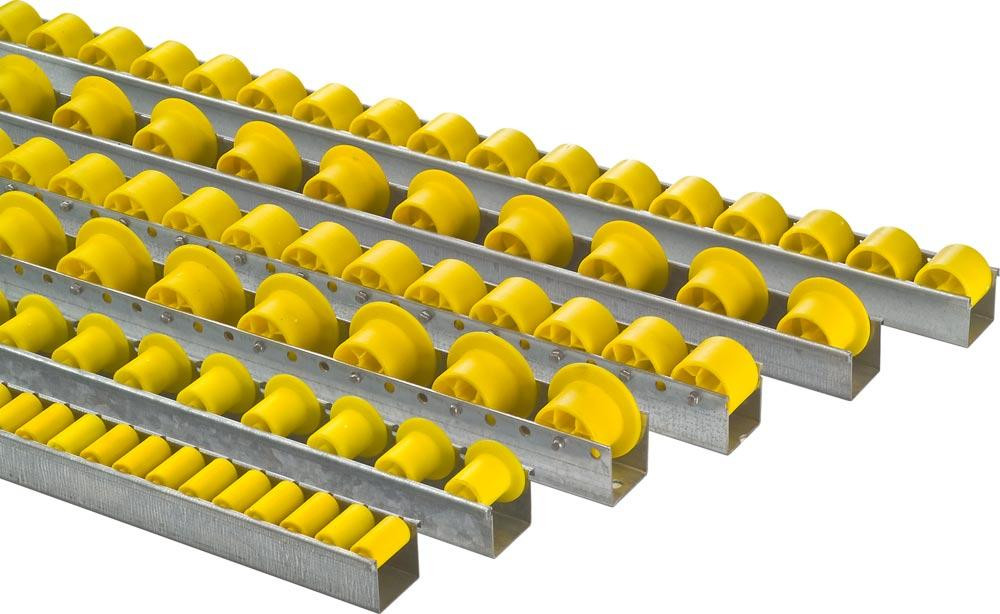 ∙ Die Lagerung der Röllchen auf Stahlachsen garantiert eine hohe Tragfähigkeit und geringen Gleitreibungswiderstand ∙ Verwindungssteife Röllchenleistenprofile aus 1,5 mm starkem, glanzverzinktem Stahlblech mit allseitig abgerundeten Kanten ∙ Gelbe Röllchen aus thermoplastischem, schlagzähem und bruchsicherem Kunststoff ∙ Beständig gegen Säuren und Laugen ∙ Keine Aufnahme von Feuchtigkeit ∙ Röllchen einzeln austauschbar ∙ Einsetzbar im Temperaturbereich von -30 °C bis 100 °C
