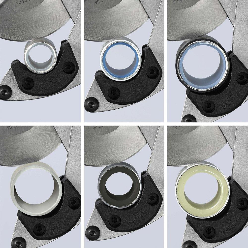 für Verbund- und Kunststoffrohre · frei drehbares Schneidrad für reibungsarmes Drehen des Rohrs · Rotationsbewegung ermöglicht müheloses Eindringen des Schneidrads bei minimierter Verformung des Rohrs · breite Kunststoff-Formauflagen für perfekt rechtwinklige Abschnitte · auch für Verbundrohre mit erhöhter Aluminiumschichtdicke (etwa Geberit Mepla) · mit Verschlussmechanismus