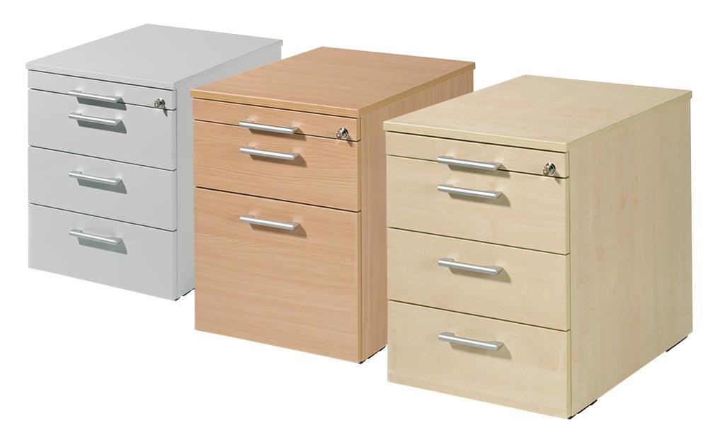 ∙ Vormontiert ∙ Hochwertige, melaminharzbeschichtete E-1-Spanplatten 19 mm stark, mit 2 mm ABS-Umleimer, Radius 2 mm gerundet · Kunststoffschubfächer auf Teleskop-Kugelführung · Utensilienschub (25 mm hoch, 2/3 ausziehbar), Schublade (130 mm hoch, 5/6 ausziehbar), Hängeregistratur (280 mm hoch, voll ausziehbar) · Einzelauszugssperre · Zentralverschluss und Zylinderschloss ∙ Metallgriffe