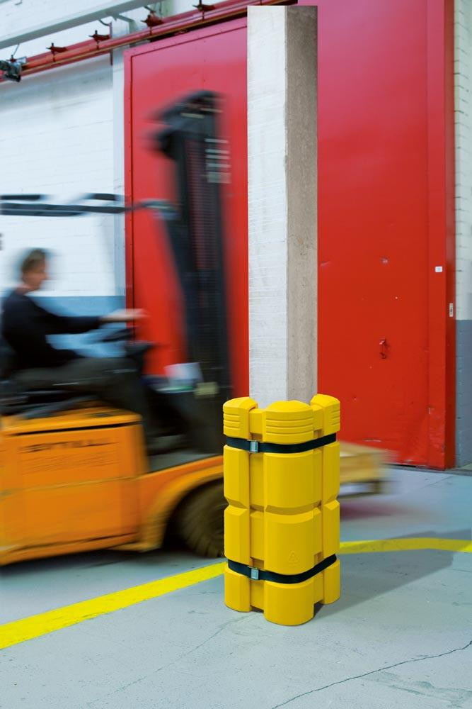 · Aus modifiziertem, gelb durchgefärbtem Polyethylen · Schutz von Rechtecksäulen vor Anfahrschäden durch Stapler, Flürförderzeuge oder Lastkraftwagen · Säulenschutz bestehend aus 4 ineinander schiebaren Einzelelementen · Für alle Säulenmaße B x T von mind. 200 x 200 mm und max. 300 x 300 mm, einschließlich aller Rechteckgrößen · 2 Spanngurte (je 2,2 m) sorgen für festen Verbund · Für den Innen- und Außeneinsatz geeignet · TÜV-geprüft