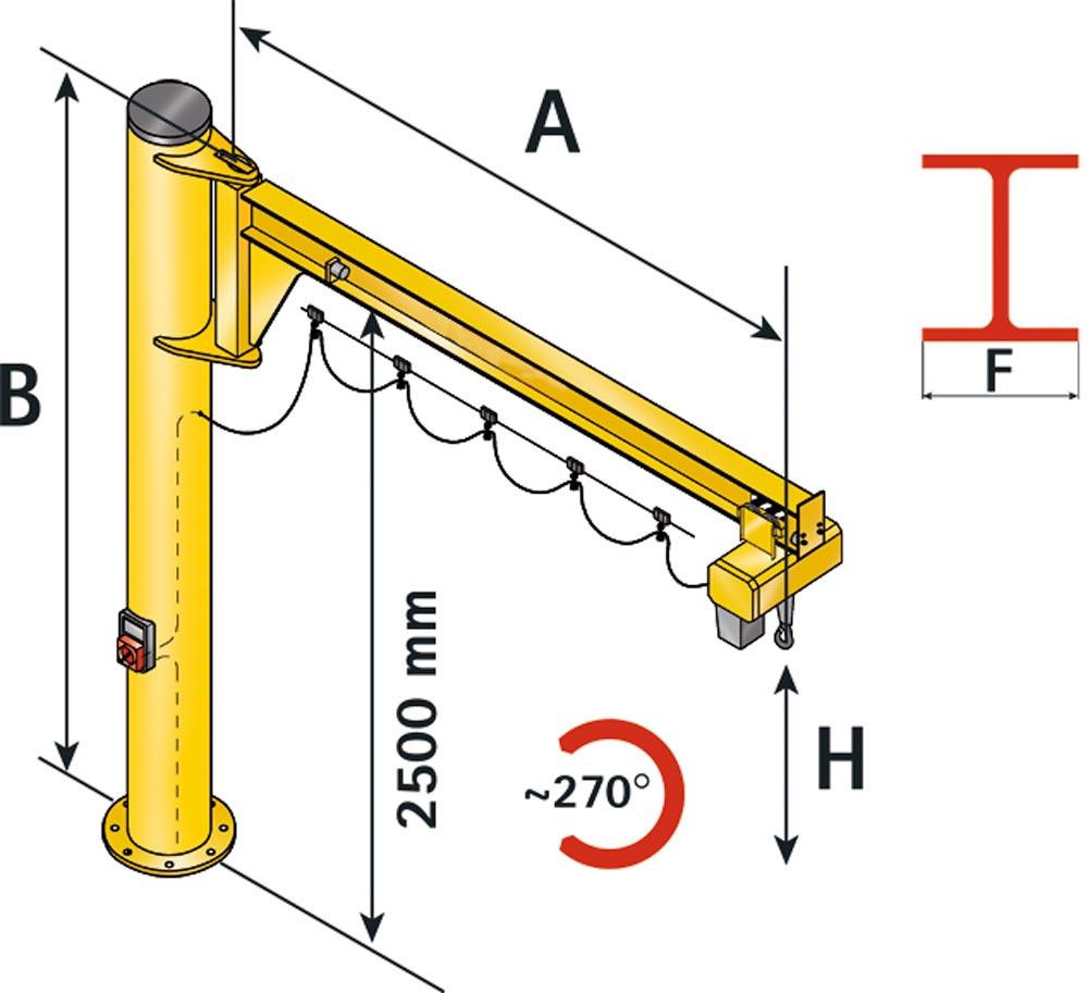 Säulenschwenkkran, ohne Elektrokettenzug, Traglast 125 kg, Schwenkbereich 270 Grad, Ausladung 3000 mm, Bauhöhe 2790 mm