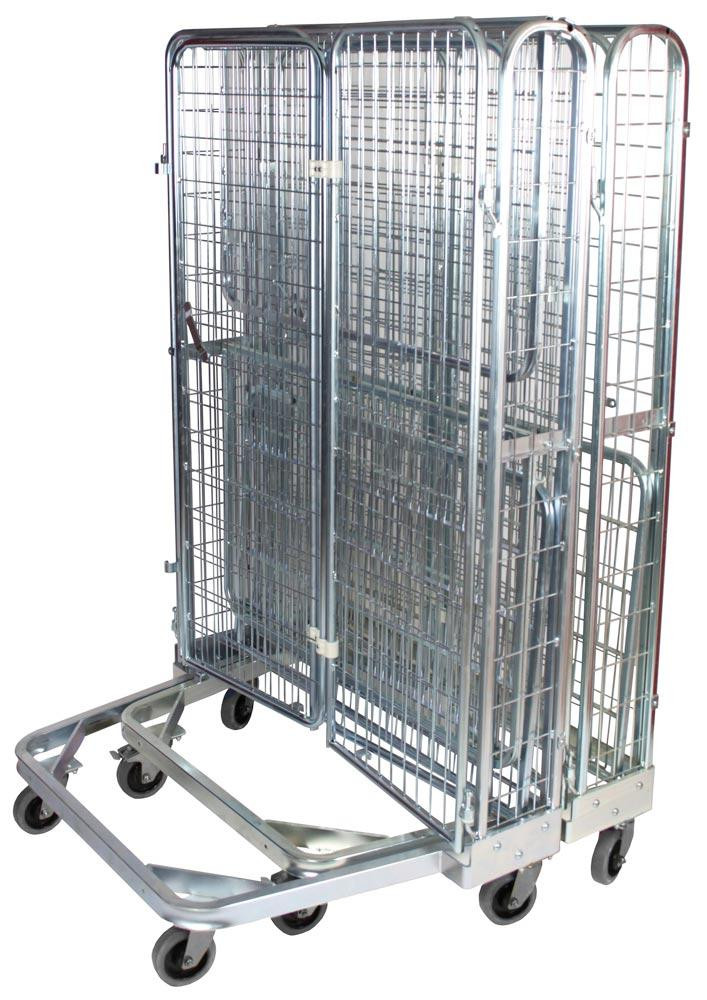 ∙ Robuste Rohrkonstruktion, Rohr-Ø 22 mm ∙ Engmaschig vergittert (100 x 50 mm) ∙ Stahlteile galvanisch blau verzinkt · Nestbar · Doppelflügeltür verschließbar mit Vorhängeschloss (Schloss gehört nicht zum Lieferumfang · 1 klappbarer Zwischenboden, an der Rückwand arretiert ∙ 4 Lenkrollen aus Elastik-Vollgummi mit Fadenschutz und verschraubter Radachse, 2 davon mit Feststeller